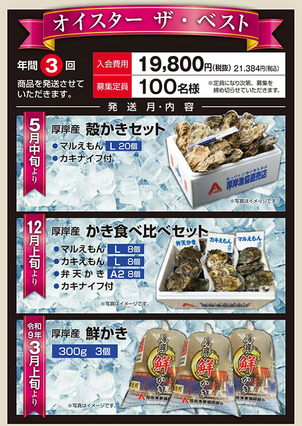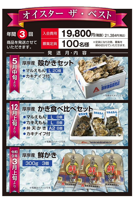 ご入会いただくと、1年間に3回、厚岸漁業協同組合直売店エーウロコの自慢の牡蠣をお届けいたします。
