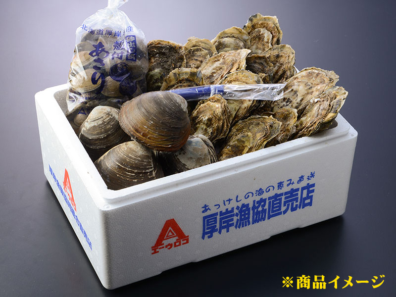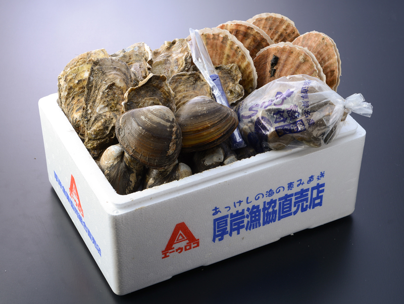 濃厚で旨味たっぷりの厚岸産殻かき (紫外線殺菌海水使用) を中心に、人気の活貝をセットにしました。