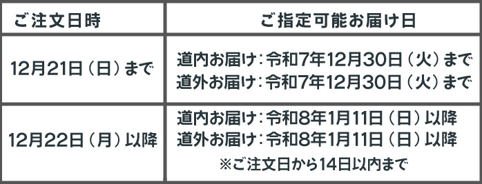 年末・年始は配送便が大変混雑いたします。 ご希望日にお届けできるよう手配させて頂きますが、道路事情・雪害・配送の混雑状況によりお届けの遅延が発生する場合がございますので、予めご了承願います。 お届け日をご指定の際は、余裕を持ったお早目の日時をお知らせくださいますようお願いいたします。 何卒、ご理解ご了承のほどお願い申し上げます。 |